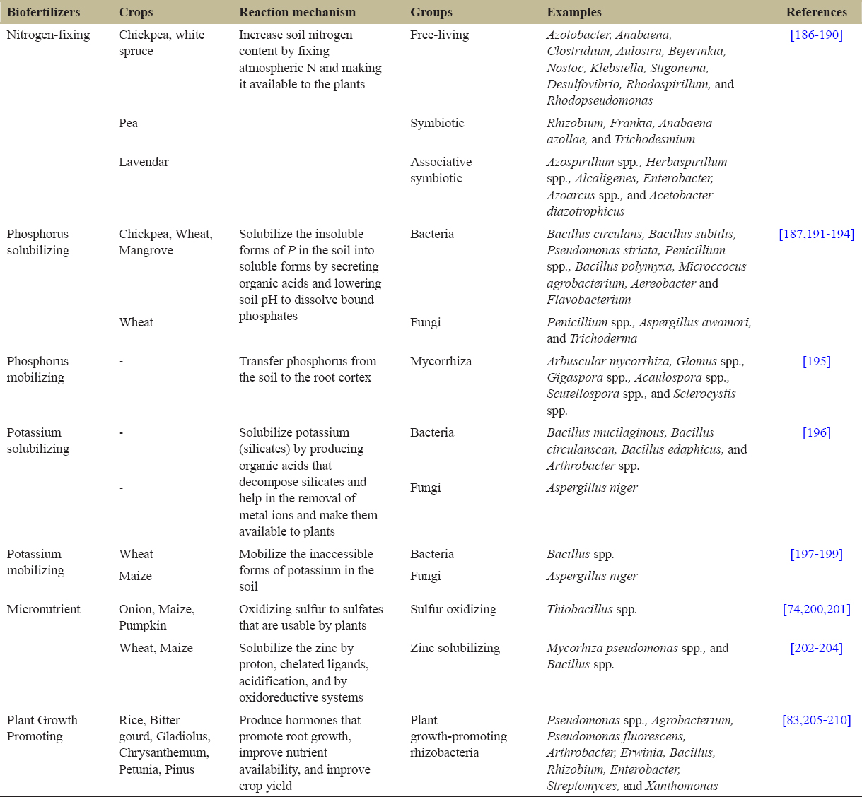 Biofertilizers | Crops | Reaction mechanism | Groups | Examples | References |