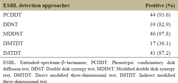 ESBL: Extended–spectrum–β–lactamase, PCDDT: Phenotypic confirmatory disk diffusion test, DDST: Double disk synergy test, MDDST: Modified double disk synergy test, DMTDT: Direct modified three-dimensional test, IMTDT: Indirect modified three-dimensional test.