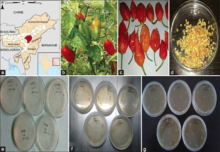 | Figure 1: Images of Capsicum annuum L. seeds and their inoculation; (a) Map of the study area (Karbi Anglong district); (b) C. annuum L. plant in natural habitat; (c) C. annuum L. fruits in the ripe stage; (d) Seeds of C. annuum L.; E-G = Inoculation of surface sterilized seeds in different media - Potato Dextrose Broth plate (e), Water Agar plate (f) and Host Extract + Agar plate (g). [Click here to view] |