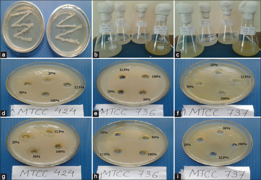 The yeast isolates CA 1 and CA 5, which showed antimicrobial activity against the human pathogen, was cultured aerobically on different concentration of PDB medium (12.5%, 25%, 50%, and 100%) by streaking method [Table 4 and Figure 4a-c]. Considerable antimicrobial activity was observed against Gram-positive bacteria (B. subtilis and S. aureus) and no antimicrobial activity was observed in all the concentrations of PDB medium against Gram-negative bacteria MTCC 424 (P. aeruginosa) [Figure 4d-f]. Antimicrobial activity against the pathogen MTCC 736 (B. subtilis) was obtained with crude metabolites of CA1 grown on 50% PDB media, whereas no such activity was observed in other concentrations of PDB media. For MTCC 737 (S. aureus), antimicrobial activity was detected with the crude metabolites of CA1 grown on 12.5% and 25% PDB medium. Crude metabolites of CA1 yeast isolates grown on other concentrations of PDB medium showed no antimicrobial activity against MTCC 737 (S. aureus).