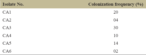 Fresh and ripe seeds of C. annuum L. were selected for the endophytic study and were found to be colonized with yeast endophytes. Maximum endophytes were recovered in the PDA medium, followed by the HEA medium, and no endophytes were recovered in the WA medium. The number of yeast colonies isolated in the PDA medium was 32 and the HEA media was 8 [Table 1]. Altogether 40 numbers of yeast colonies were isolated, and the isolates represent six distinct colonies. The colonization frequencies of the six distinct isolates were studied. Among the isolates, isolate number CA3 was found to be the highest with a CF of 30%, followed by isolate numbers CA1 and CA5 with colonization frequencies of 20% and 14%, respectively [Table 2].