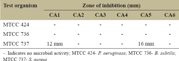 -: Indicates no microbial activity; MTCC 424- P. aeruginosa; MTCC 736- B. subtilis; MTCC 737- S. aureus