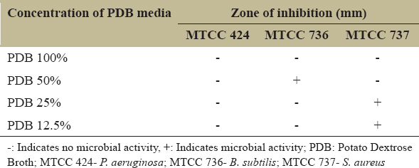 -: Indicates no microbial activity, +: Indicates microbial activity; PDB: Potato Dextrose Broth; MTCC 424- P. aeruginosa; MTCC 736- B. subtilis; MTCC 737- S. aureus