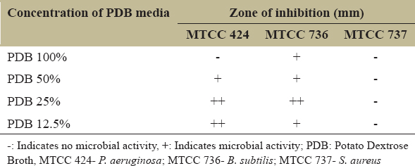 -: Indicates no microbial activity, +: Indicates microbial activity; PDB: Potato Dextrose Broth, MTCC 424- P. aeruginosa; MTCC 736- B. subtilis; MTCC 737- S. aureus