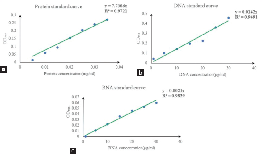 | Supplementary Figure 2: (a) Protein standard curve; (b) DNA standard curve; and (c) RNA standard curve. [Click here to view] |