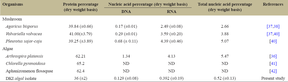 Table 1: A comparative summarization of bimolecular contents in DK1 with other algae and mushroom (where ND refers to not-determined)
