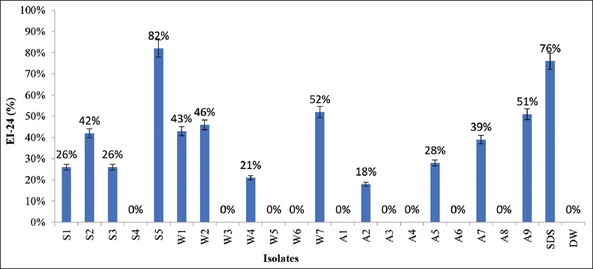 | Figure 1: Emulsification index (EI-24) of the isolates. SDS: Sodium dodecyl sulfate, DW: Distilled water. [Click here to view] |