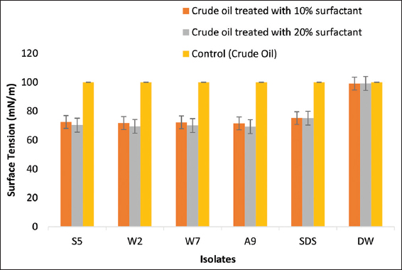 | Figure 2: Surface tension reduction by the isolates. SDS: Sodium dodecyl sulfate, DW: Distilled water. [Click here to view] |
