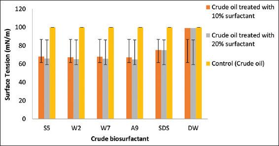 | Figure 5: Surface tension reduction by the crude biosurfactant. [Click here to view] |