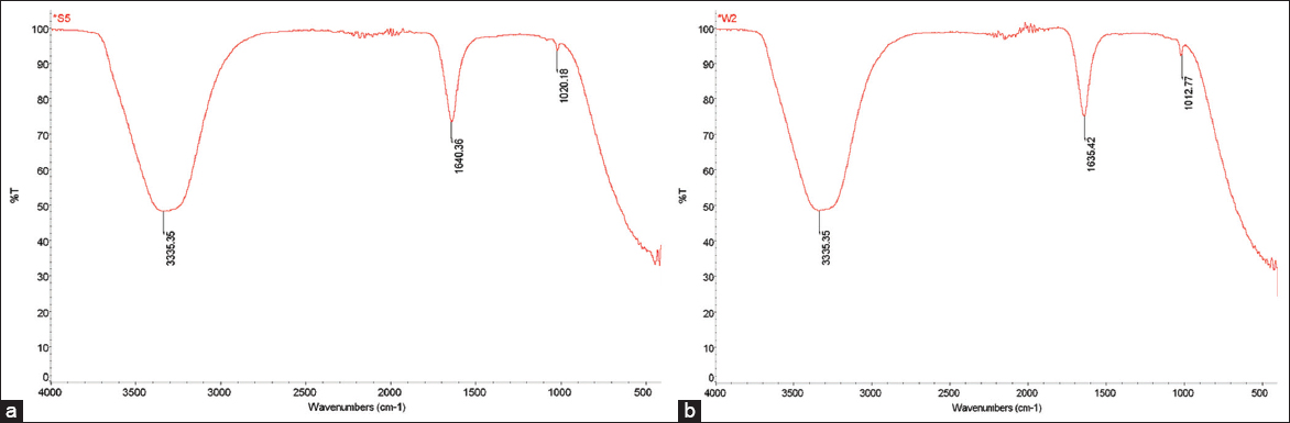 Molecular characterizations of the BS produced by the isolates were carried out by FTIR spectroscopy [Figures 7 and 8]. In FTIR spectra, detected peaks showed the presence of specific bonds characteristic of BS produced by many microorganisms. Peaks at 1,075 cm−1 indicated the amide groups of proteins. Strong bands between 3,000–3,600 cm−1 and 1,640–1,700 cm−1, as well as 1,500–1,620 cm−1, corresponded to NH group, C=O stretching in protein and NH bending in proteins, respectively, indicating proteins in the BS samples [Table 5].