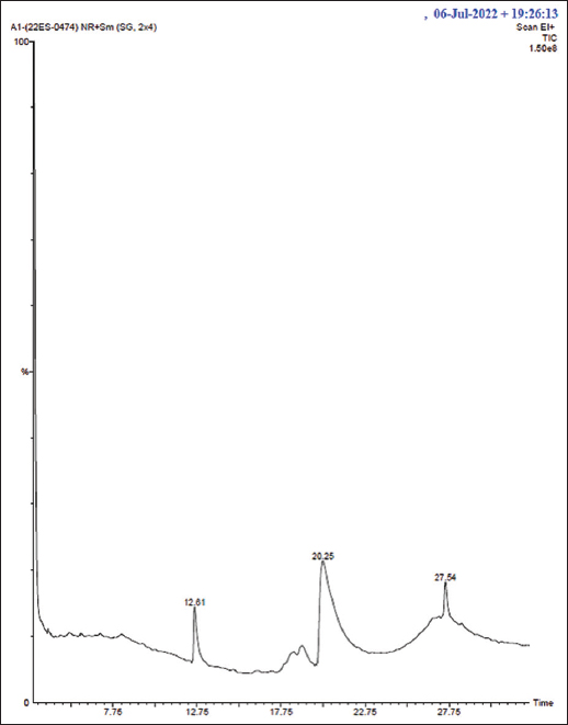 | Figure 9: Gas chromatography-mass spectrometry of biosurfactant produced by Bacillus siamensis (Isolate W7). [Click here to view] |
