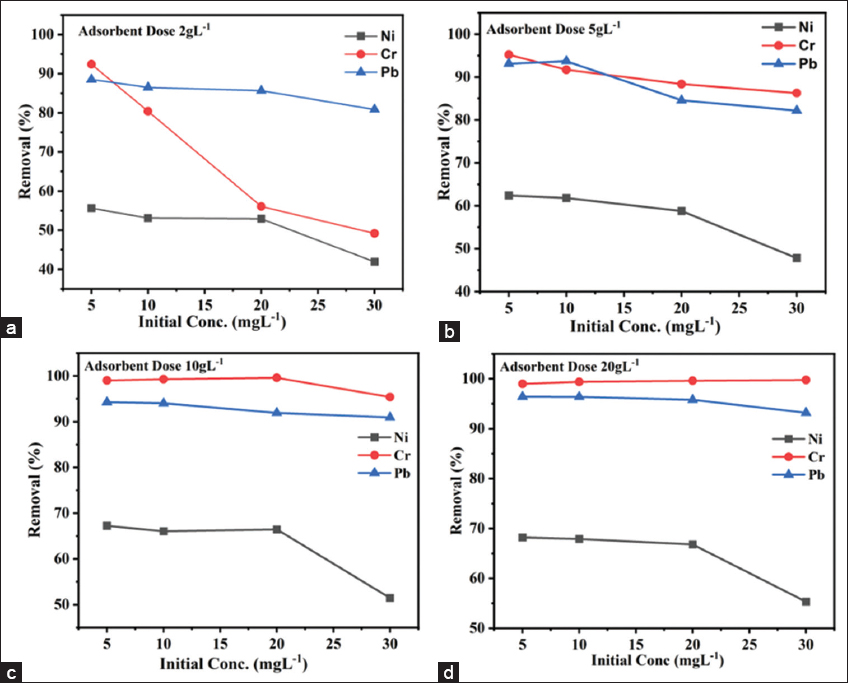 Experiments were conducted with initial concentrations of Cr, Pb, and Ni (5 mg/L, 10 mg/L, 20 mg/L, and 30 mg/L) and varying biosorbent doses (2 g/L, 5 g/L, 10 g/L, and 20 g/L) over a reaction time of 90 min. Figure 4a illustrates the effect of a 2 g/L biosorbent dose on the removal of Cr, Pb, and Ni at concentrations of 5 mg/L, 10 mg/L, 20 mg/L, and 30 mg/L. The results show that a 2 g/L dose reduced the initial Cr concentration from 5 mg/L to approximately 92%, Pb to about 88%, and Ni to roughly 55%. As the initial concentration of metal ions increased, the removal efficiency decreased [27]. Figure 4b presents the results for a 5 g/L FBFWP biosorbent dose, which efficiently reduced Cr and Pb concentrations (5 mg/L, 10 mg/L, 20 mg/L, and 30 mg/L) by about 85%, while Ni removal showed around 60% efficiency at an initial concentration of 5 mg/L. Figure 4c and d show results for biosorbent doses of 10 g/L and 20 g/L, respectively, where Cr and Pb ions achieved approximately 90% removal efficiency, and Ni ions showed around 50% efficiency at concentrations of 5 mg/L, 10 mg/L, 20 mg/L, and 30 mg/L. As the biosorbent dose increases, the number of available adsorption sites increases, thereby enhancing removal efficiency. Similar findings were reported by Surisetty et al. [28] in their study on Pb removal from aqueous solutions using F. benghalensis leaves.