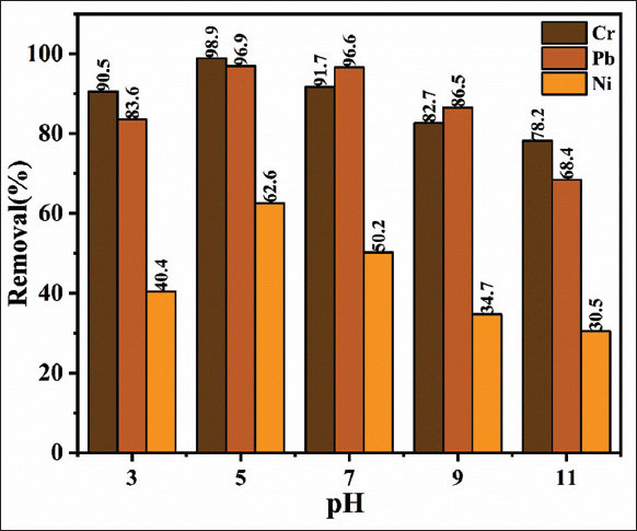 | Figure 5: pH-adsorption study of Ficus benghalensis fruit waste powder biosorbent for Cr, Pb and Ni uptake from water (at 10 mg/L concentration, 5 g/L adsorbent dose and reaction time of 120 min). [Click here to view] |