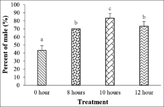 The present study indicates that the immersion duration with P. alpina extract has a significant effect (P < 0.05) on the percentage of male fish. In the 0-h treatment, the percentage of males was 43.33%. In the 8-h treatment, the percentage increased by 70.00%. In the 10-h treatment, the percentage elevated to 83.33%. Yet, in the 12-h treatment, the percentage reduced to 73.33%. The 0-h treatment exhibited a significant difference (P < 0.05) from all other treatments. The 8-h treatment exhibited a statistically significant difference (P < 0.05) from the 10-h treatment. Meanwhile, the 12-h treatment had no statistically significant difference (P > 0.05) from the 8- and 12-h treatments [Figure 1].