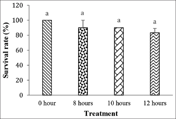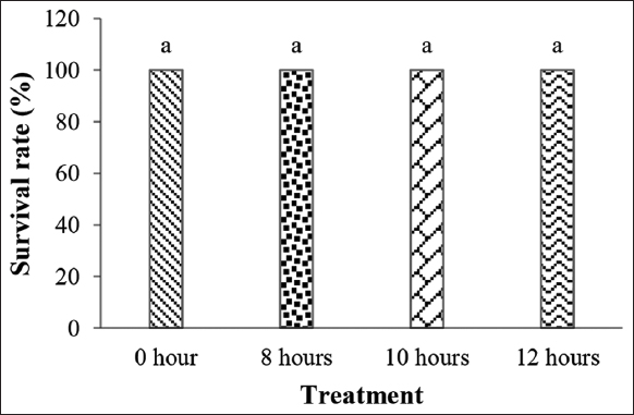 | Figure 2: Survival of guppy fish (Poecilia reticulata) larvae during immersion in purwoceng (Pimpinella alpina) extract. The same letters indicate non-significant differences between treatments (P > 0.05). [Click here to view] |