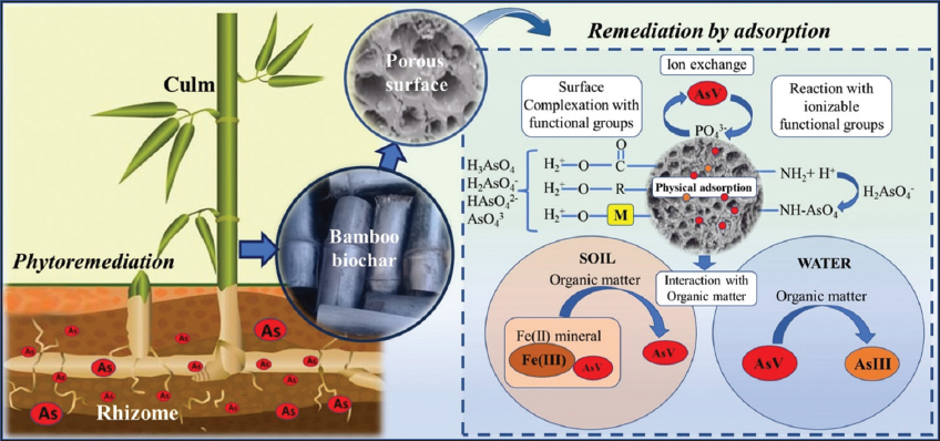Given the risk of As leaching from soil into drinking water or being absorbed by crop plants, studies investigating the efficacy of bamboo-derived biochar for remediating As-contaminated soil have emerged in recent years. Research with this adsorbent has demonstrated its influence on soil, affecting not only the concentration of As but also its bioavailability to plants. Bamboo biochar effect on the As-soil-plant system depends on different factors such as soil type, biochar dosage, dissolved organic matter, and biochar surface modification.