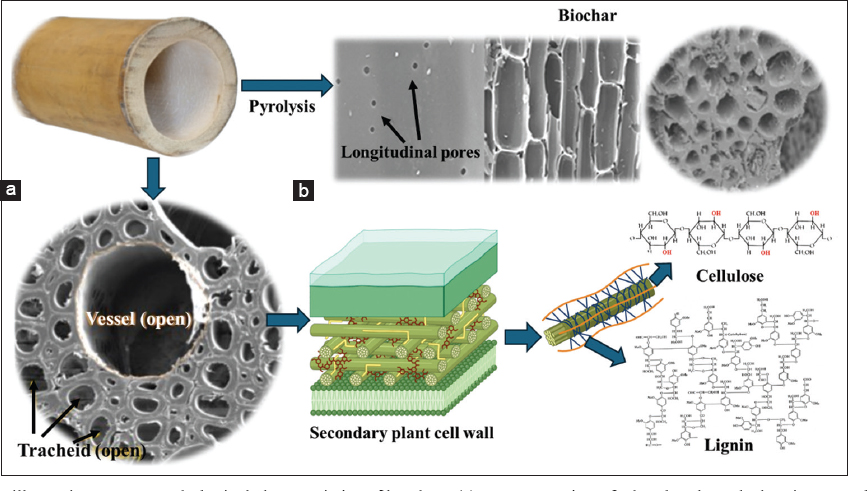 ![]() | Figure 2: Scheme illustrating some morphological characteristics of bamboo. (a) A cross-section of a bamboo branch showing vascular bundles, tracheid, and sclerenchyma cells with thick secondary walls due to high lignin content. (b) Longitudinal and cross-sectional views of bamboo biochar resulting from pyrolysis. When pyrolysis temperatures exceed 400°C, cellulose and lignin decompose, altering the characteristics and morphology of the resulting biochar. The scanning electron microscope images of bamboo and bamboo biochar are adapted from Li et al., 2022 [72], Pinisakul et al., 2023 [24], and Alchouron et al., 2020 [6], respectively. [Click here to view] |