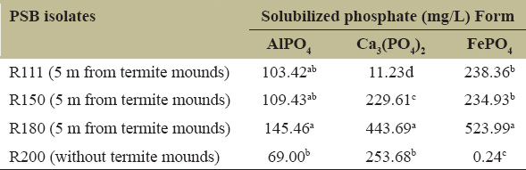 Our study found that bacteria isolated from rice fields at a distance of 5 m from termite mounds can dissolve phosphate in the forms of FePO4, Ca3(PO4)2, and AlPO4. AlPO4 and FePO4 are the main forms that cause phosphorus uptake issues in sandy soils with low pH [69]. The highest solubility of phosphate in the form of FePO4 was 523.99 mg/L at P < 0.01, followed by Ca3(PO4)2 at 443.69 mg/L and AlPO4 at 103.42–145.46 mg/L [Table 3]. Moreover, one PSB, isolated from a rice field without termite mounds, can dissolve phosphate in the form of Ca3(PO4)2 as opposed to AlPO4 and FePO4. Ca3(PO4)2 is the main form that causes phosphorus uptake in alkaline soil and affects soil organic carbon stocks [70].