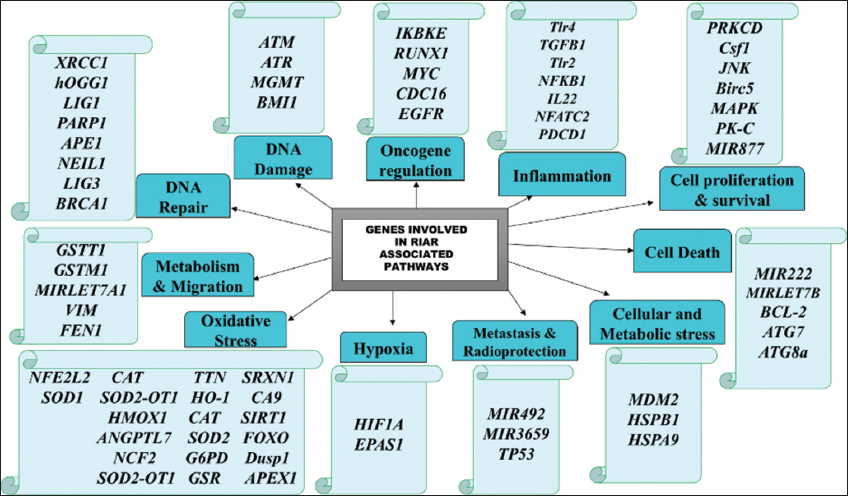 In vitro laboratory experiments with cell lines have demonstrated the existence of RIAR phenomenon followed by exposure to radiochemicals and radiation [4,5]. Various types of end-points (cytogenetic, genetic, proteomic, metabolic, or epigenetic) were employed to demonstrate the radio-resistance in those systems [6]. Scrutiny of literature has shown that many genes and gene products are involved in mediating the response; identifying the ideal candidate and inhibiting the molecule/pathway are proposed as new targets for cancer RT [7,8]. There are a lot of challenges in the existing therapeutic targets because of their specificity, sensitivity, and lack of standardization. Hence, an advancement in the categorization of genetic and epigenetic biomarkers via the in silico approaches may be helpful in identifying the pathways and molecules in mediating the response and confers resistance. The molecular mechanisms of RIAR have not been completely understood till date as this phenomenon remains challenging. Thus, understanding the gene-gene interactions is essential for unraveling the complex biological mechanisms in RIAR.