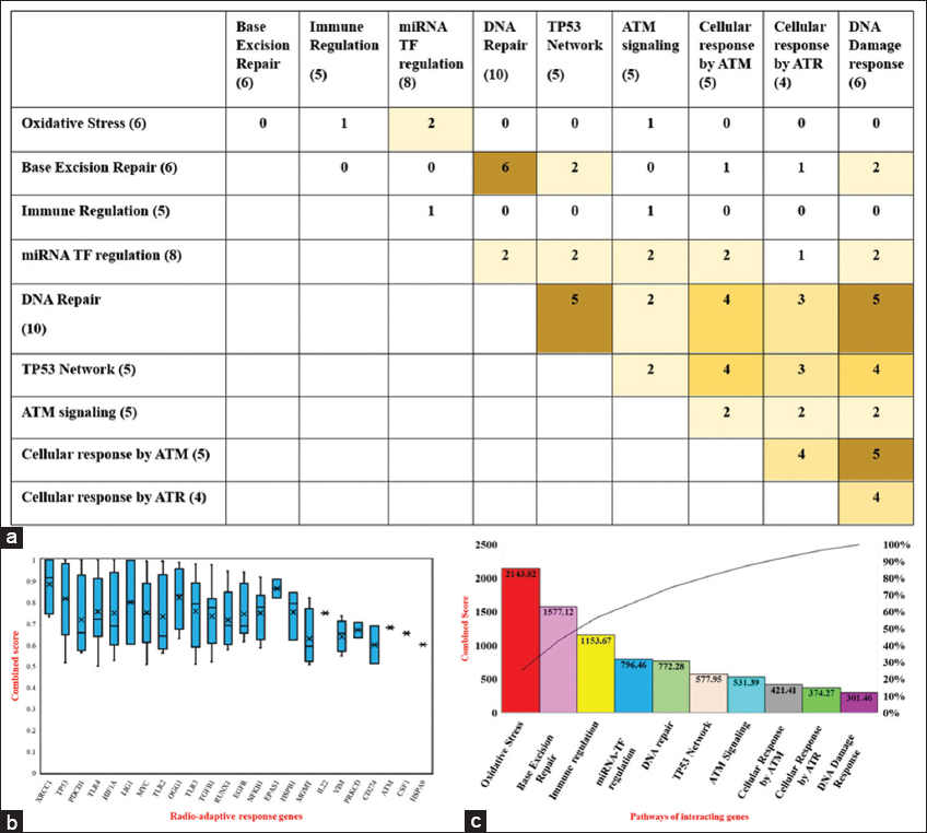 Breast cancer is the most common type of cancer in women diagnosed as of 2020, and it is the leading cause of cancer morbidity, disability, and mortality in women globally [14]. The RT remains a standard palliative therapy for curing breast cancer. The types of gene interactions may be categorized into gene regulatory networks, protein-protein interactions, regulation of gene expression, and crosstalk among pathways [15-17]. The coordinated cellular response to radiation depends on these gene-gene interactions, which affect the cancer patient’s response to RT. The genes represented in Figure 1 are known to be reported in previous literature, among which DNA repair and oxidative stress pathways are highly involved in RIAR. Also, the GSEA results comprising the genes and highly enriched pathways such as DNA repair and oxidative stress [Figure 2a-c] were in correlation with the gene-gene interaction results from Cytoscape (v 3.10.2) [Figure 3a] and STRING databases [Figure 3b]. p53 plays a main role in regulating other genes and is a major contributor for the occurrence of RIAR via seven major pathways [Figure 3b].