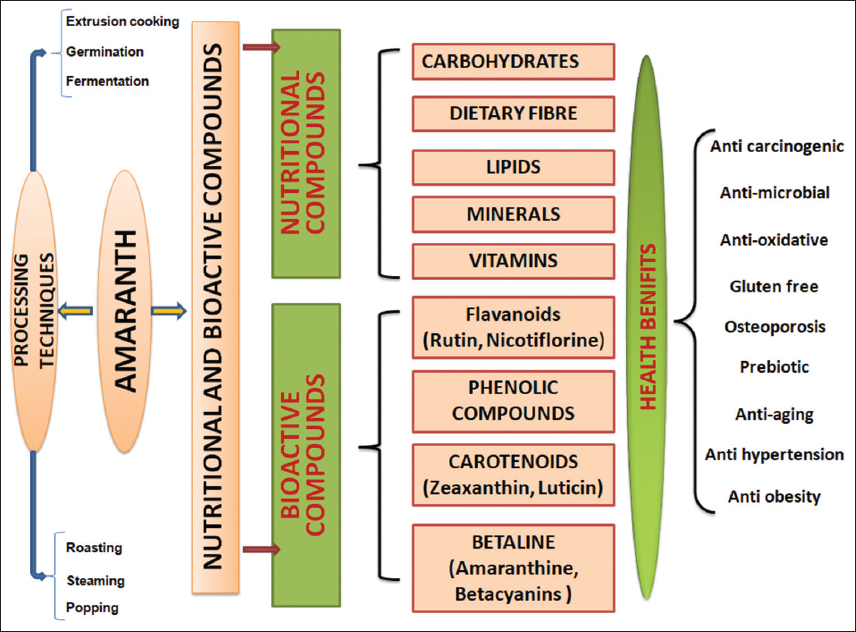 Amaranths are a nutrient-dense powerhouse rich in bioactive compounds such as carotenoids, polyphenols, and flavonoids. These compounds are associated with a range of health benefits, including antioxidant, anti-inflammatory, and anticancer properties. The presence of these bioactive compounds enhances amaranth’s potential to promote overall health, reduce oxidative stress, and prevent disease. Additional discussion involving multiple pseudocereals including quinoa and buckwheat will display beneficial aspects along with practical uses for these underused crops. Amaranth is recognized for its high protein content and lipids but quinoa delivers all essential amino acids while buckwheat stands out with its flavonoids such as rutin that act as antioxidants. Their special nutritional properties make them attractive choices instead of conventional cereal products. Although this amaranth has anti-nutritional factors, oxalates, phytase, and saponins, which can reduce nutrient absorption and increase amaranth digestibility. To counter these results, different processing methods, including soaking, fermentation, and cooking, are used to increase bioavailability of nutrients and reduce the amounts of antinutrients. For maximum health benefits of amaranths and its use in functional foods, these aspects are critical.