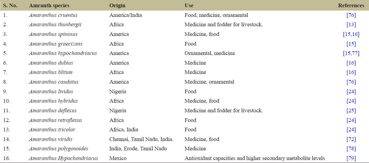 | 1. | Amaranthus cruentus | America/India | Food, medicine, ornamental | [76] |