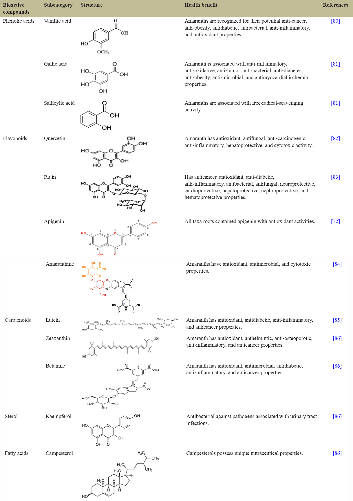 | Phenolic acids | Vanillic acid | ![]() | Amaranths are recognized for their potential anti-cancer, anti-obesity, antidiabetic, antibacterial, anti-inflammatory, and antioxidant properties. | [80] |