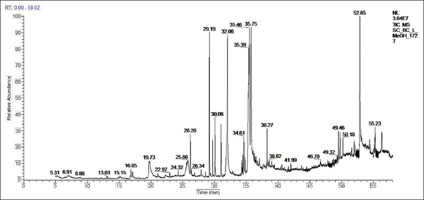 | Figure 1: Gas chromatography-mass spectrometry chromatogram of the plant Bergenia ciliate. [Click here to view] |