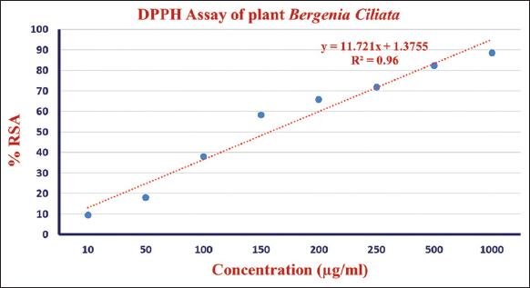 | Figure 4: Antioxidant activity of the methanolic extract of the plant Bergenia ciliata by the 2,2-diphenyl-1-picrylhydrazyl assay. [Click here to view] |