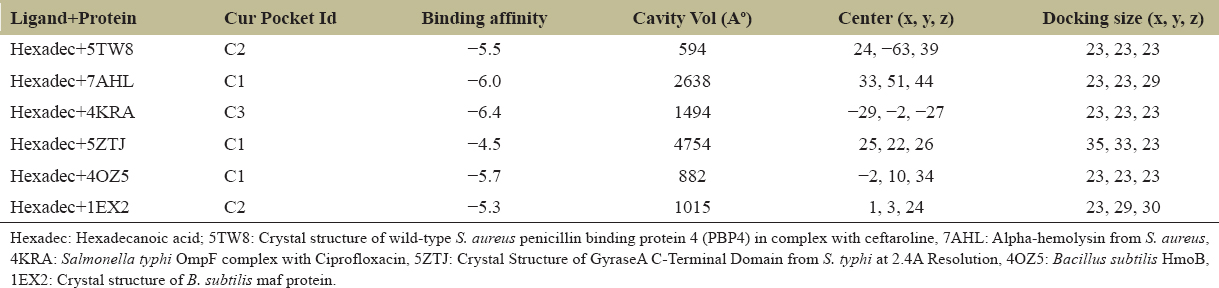 Hexadecanoic acid, identified as the major bioactive component of the methanolic extract of B. ciliata through GC-MS analysis, was selected for molecular docking studies to evaluate its interaction with key pathogenic targets from S. aureus and Salmonella typhi – two clinically relevant human pathogens. The 3D structure of hexadecanoic acid was retrieved from the PubChem database (https://pubchem.ncbi.nlm.nih.gov/), whereas the crystal structures of bacterial target proteins were downloaded from the Protein Data Bank (PDB) (https://www.rcsb.org/). The selected protein targets included 5TW8: Crystal structure of wild-type S. aureus penicillin binding protein 4 (PBP4) in complex with ceftaroline, 7AHL: Alpha-hemolysin from S. aureus, 4KRA: Salmonella typhi OmpF complex with Ciprofloxacin, 5ZTJ: Crystal Structure of GyraseA C-Terminal Domain from S. typhi at 2.4A Resolution, 4OZ5: Bacillus subtilis HmoB, 1EX2: Crystal structure of B. subtilis Maf protein. These proteins are crucial for bacterial cell wall synthesis, DNA replication, and membrane permeability, making them attractive targets for antibacterial drug development. Protein-ligand binding was studied using the CB-dock-2 online tool, and the docking was performed within a grid box large enough to encompass the entire active site: The grid box size was set to 23 × 23 × 23 Å (unless otherwise noted), centered at the binding pocket coordinates [Table 1]. Default docking parameters were used, and the exhaustiveness was set to 8 to ensure sufficient sampling. The top-ranked conformations based on binding affinity (kcal/mol) were selected for interaction analysis. To validate the docking protocol, redocking of the native ligand into its co-crystallized binding site was performed where available, and root mean square deviation (RMSD) values <2.0 Å were considered acceptable for protocol accuracy. Visualization and interaction analysis were conducted using PyMOL and Discovery Studio Visualizer.