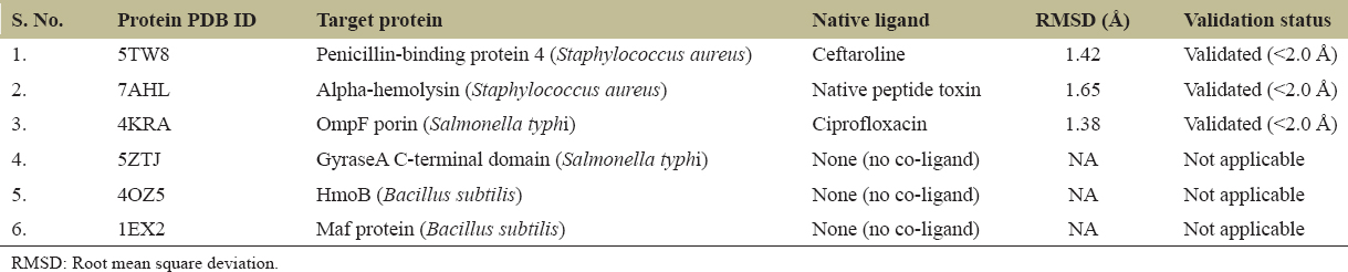 | S. No. | Protein PDB ID | Target protein | Native ligand | RMSD (Å) | Validation status |