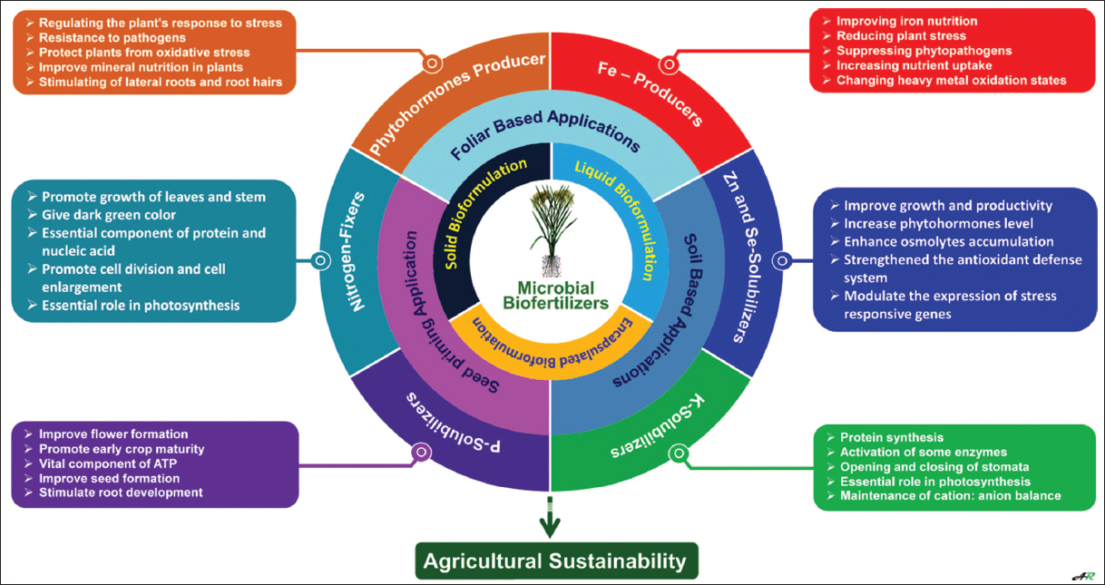 Agriculture and agricultural products have been our sole source of existence since human evolution [1]. To maintain a healthy lifestyle, the vast majority of people on the planet depend on agriculture for food, feed, other essentials, and secondary products with therapeutic value. To address the growing population’s hunger needs, researchers, agricultural experts, and agro-industries should develop appropriate sustainable agricultural practices [2]. Managing agricultural operations to a degree that can effectively eradicate the need for hunger is the primary goal of any civilized empire. Traditional agricultural practices only provide food and feed on a residential scale. Only the farmer’s families and the local village communities possess access to traditional ways. Agricultural practices are evolving in a surprising way these days as people are more concerned with protecting the environment and focusing on the agricultural system to maximize agro-productions using different types of microbial biofertilizers [Figure 1]. In farming processes, different hormones, chemical fertilizers, and other synthetic minerals are used to increase crop yields. The health of the soil and the plant system are both impacted by synthetic chemicals and minerals. While greater chemical use may lead to increased output, the depletion of vital minerals and other nutritional components might occasionally function as a barrier [3].