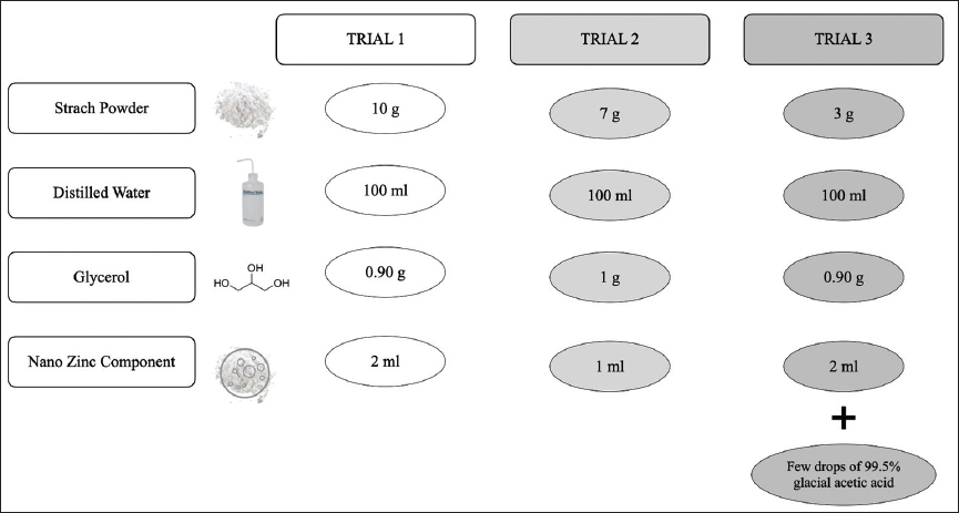 The initial protocol was performed as three trials for standardization of the procedure as shown in Figure 1. The first trial involved dissolving 10 g of the starch powder in 100 mL of distilled water, with addition of 0.90 g of glycerol and 2 mL of nano zinc component. The second trial involved dissolving 7 g of the starch powder in 100 mL of distilled water, with the addition of 1 g of glycerol and 1 mL of nano zinc component. The final trial involved dissolving 3 g of the starch powder in 100 mL of distilled water, with the addition of 0.90 g of glycerol, a few drops of 99.5% glacial acetic acid and 2 mL of nano zinc component.