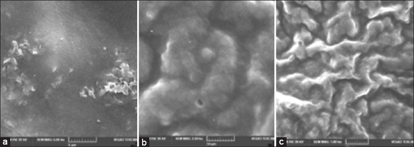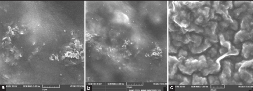 | Figure 4: Scanning electron microscopy analysis of zinc oxide nanoparticles embedded potato starch biofilm; ×5,000 (a), ×2,500 (b), ×1,000 (c) size of potato starch biofilm: 11.6 µm. [Click here to view] |