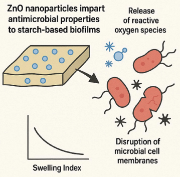In this study, we aim to develop ZnO NPs embedded starch biofilms from potato starch and corn starch as alternatives to plastic packaging for food materials and evaluate their effectiveness and efficiency by testing their sensory characteristics and functional properties.