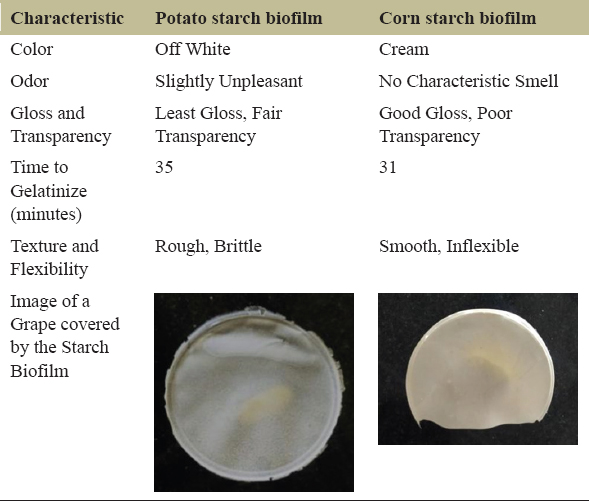 The potato starch biofilm was off-white in color, had a slightly unpleasant smell, and exhibited the least gloss. It was also rough and brittle, and took the most time to gelatinize. However, it was fairly transparent. The cornstarch biofilm was cream-colored, had no characteristic smell, and possessed a good gloss. Although it had a smooth surface, it was inflexible and exhibited poor transparency; the grape, when covered was thus the least visible [Table 2]. Figure 4 refers to the images provided within