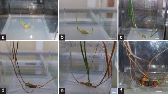 The regenerated plantlets were replanted in a 1:1:1 mixture of soil, sand, and cocopeat for hardening and transferred to the greenhouse after 1 week [Figure 2e]. All the plantlets survived, showing 100% survival after 1 week. Gradually, the leaves dried out, much like the conditions in the wild. Here, in this study, a new corm arising from a preceding corm suggests clonal multiplication. The corms were collected, shade dried, and preserved in refrigeration at 4°C for further experiments [Figure 2f]. Apparently, the corms showed sprouting in the subsequent experiments, confirming complete viability. The overall shooting and rooting responses of I. stellata corm explants to BAP and NAA, respectively, are consistent with the reports available for I. indica [18] from the Colchicaceae family, indicating the species-specific response.