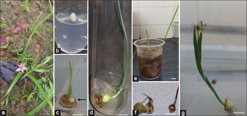| Figure 2: In vitro propagation of Iphigenia stellata Blatt. using rhizome corm explants: (a) native habitat; (b) shoot initiation with corm bud explant; (c) shoot initiation and induction of microcorms (marked with arrow), (d) in vitro shoot growth and regenerated plants with a well-developed root system; (e) hardening of plantlets; (f) harvesting of microcorms and (g) in vitro flowering in I. stellata. Scale bar = 1 cm. [Click here to view] |