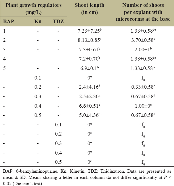 | Plant growth regulators (mg/L) | Shoot length (in cm) | Number of shoots per explant with microcorms at the base | ||