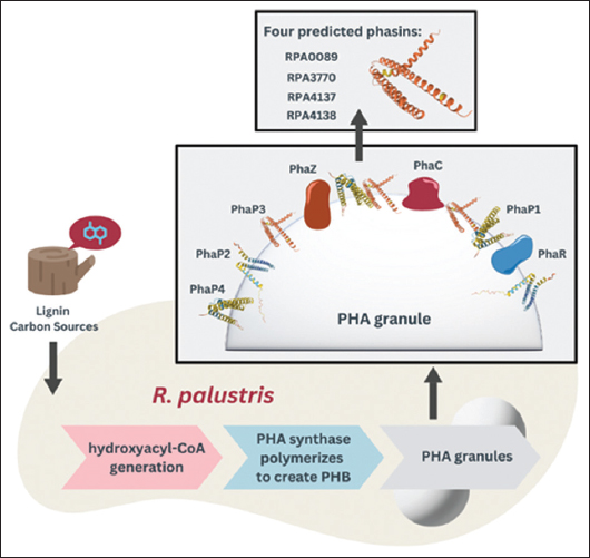 However, the regulatory network underpinning PHA metabolism in R. palustris remains poorly understood. PHA biosynthesis involves granular-associated proteins (GAPs), including synthases, depolymerases, PHA repressor proteins, acyl-CoA synthase, and phasins [Figure 1]. Phasins, in particular, are small amphiphilic proteins that coat PHA granules and play key roles in granule formation, stabilization, and metabolic regulation [18-20]. Once thought to serve only structural functions, phasins are now recognized for chaperone-like activities and for mitigating stress in both PHA-producing and non-producing cells [21].