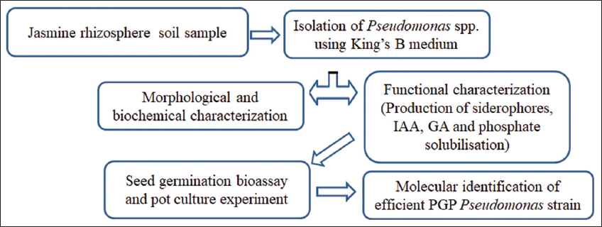 Pseudomonas spp. are Gram-negative, rod-shaped, beneficial rhizobacteria found in the rhizosphere [6]. Although some species of rhizobacteria have been reported to cause plant diseases, most of them are known for plant growth-promoting (PGP) properties [7]. Pseudomonas spp. with PGP properties rapidly colonize by utilizing exudates secreted by plant roots [8,9]. The well-established mechanisms of plant growth promotion include the production of enzymes, metabolites, phytohormones, mineral phosphate solubilization, siderophores, and imparting resilience against biotic and abiotic stresses. Currently, other PGP microbes are not used to cultivate Udupi jasmine, mainly because of their nescience [3]. While PGP Pseudomonas are available in the local markets, they fail to bring about the desired effect as they are non-native to that location and fail to adapt to the soil conditions prevalent in jasmine-growing soils. The present study attempts to isolate native Pseudomonas strains that adapt easily to soil conditions, protecting them from the indiscriminate use of chemicals, which leads to decreased cultivation costs and soil degradation.
