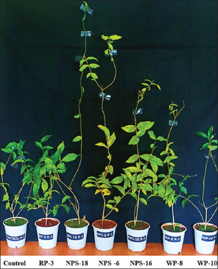 The effect of Pseudomonas isolates on jasmine growth was evaluated using a pot culture experiment. Compared with the uninoculated control, treatment with Pseudomonas significantly enhanced plant growth [Table 4 and Figure 5]. NPS-18 demonstrated outstanding improvement in plant growth, recording a significantly greater plant height (61.33 ± 4.16 cm) and number of internodes (28.00 ± 2.64) compared to all the other treatments, including control. This accounted for an increase of 95.8% and 13.94% compared to plant height and number of internodes, respectively, relative to the control [Table 4]. Treatments with NPS-6 and NPS-18 recorded the highest number of leaves of 24.66 ± 3.78 and 24.33, respectively, which are significantly higher than the uninoculated control (20.00 ± 2.00).