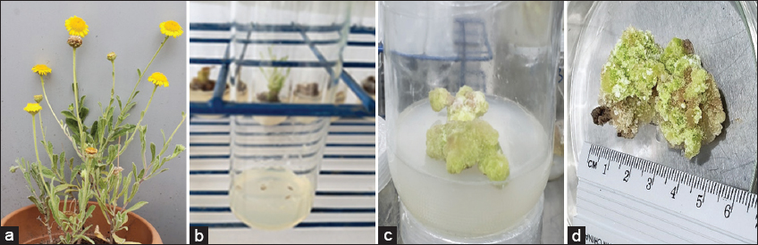 | Figure 1: (a) Morphology of Pulicaria jaubertii; (b) Seeds; (c) Callus used as explants; (d) Harvested callus for extraction. [Click here to view] |