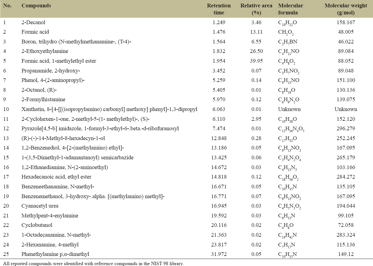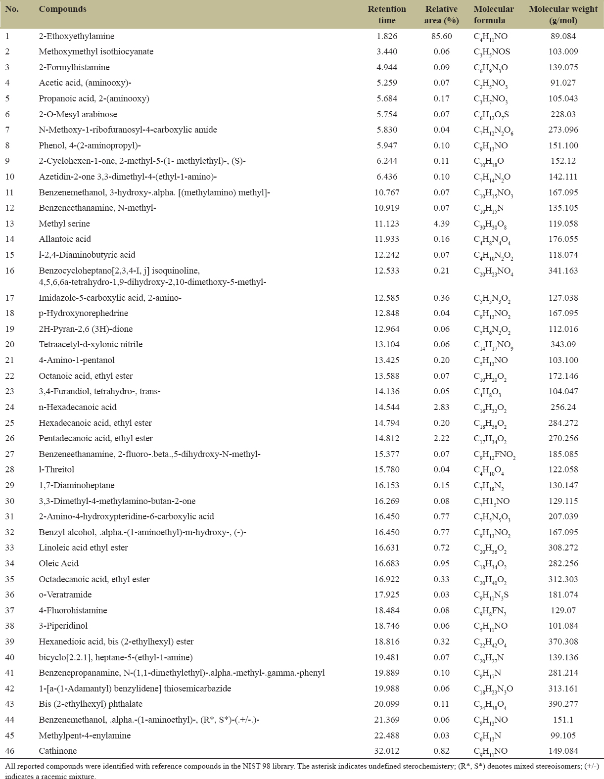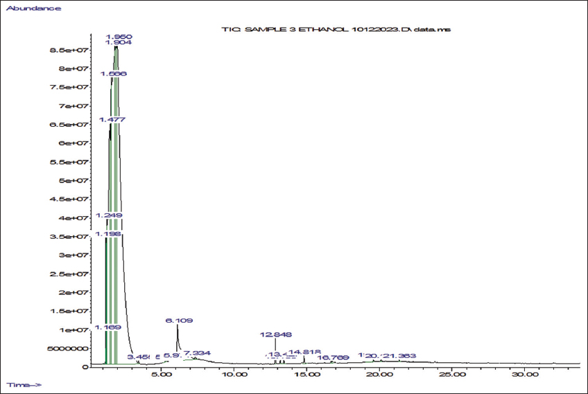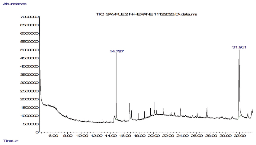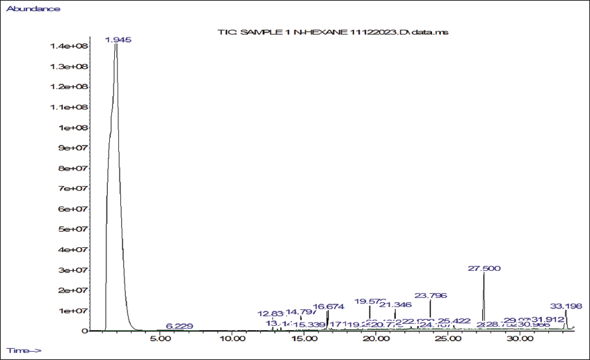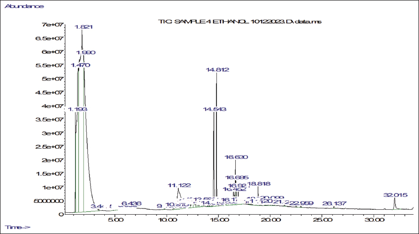 Ethanol and n-hexane extracts were made from shade-dried powder obtained from the mother and callus derived from micropropagated explants of P. jaubertii. The four extracts were prepared using the cold maceration method and then concentrated at 45°C using a rotary evaporator (Büchi, Switzerland). We determined the volatile phytochemicals following the procedure by Yisak et al. [42] with some modifications. GC-MS analysis was done using an Agilent 7890A gas chromatograph coupled with a 5975C mass spectrometer (Agilent, USA) equipped with electron ionisation (EI) for phytochemical analysis. Chromatographic separations were carried out using an HP-5MS (19091S-433) capillary column that is 30 m long, has a 0.25 mm internal diameter, and a 0.25-µm column phase film thickness. The injection mode was split-less, Helium served as the carrier gas, and we injected 1 µL of the sample at a consistent flow rate of 1 mL/min into an inlet heated to 275°C. The initial oven temperature was 60°C with a 2-minute hold time, then increased to 200°C with a ramp of 10°C/min and 3°C/min to 240°C. The ion source temperature was set to 230°C for the mass spectrometer settings, and the quadrupole temperature was 150°C. The system ran in positive electron impact mode at 70 eV, scanning from 40 to 650 m/z. The total run time was 45 minutes. Phytochemical components were qualitatively identified by comparing their retention times and mass spectral data with those in the NIST98 library.