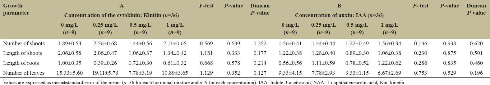 Data were summarized in tables as frequencies and proportions. Crosstabulation and Fisher’s exact test were used to study the effect of different concentrations of the hormones on the non-parametric markers of plant growth. One-way analysis of variance, followed by Duncan’s Multiple Range test, was used to compare the means of the parametric values produced at various concentrations of the hormones. Data analysis was performed using the statistical software Statistical Package for the Social Sciences version 20.0, and P ≤ 0.05 was taken as significant.