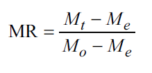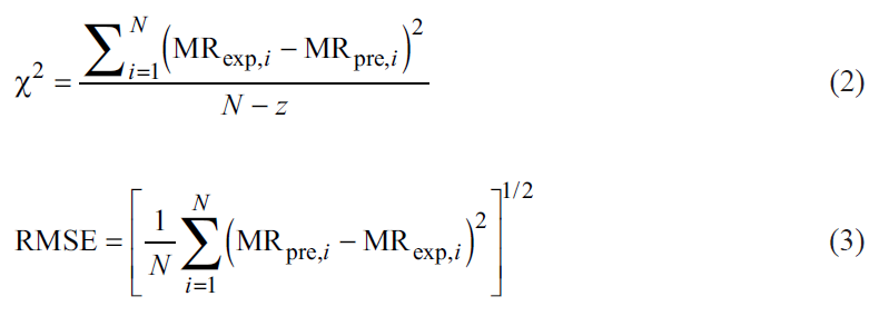The values of χ2 and RMSE were calculated according to equations 3 and 4 [32]. Where N is the number of experimental points, z is the number of model parameters, MRexp and MRpre are the experimental and predicted MR ratios, respectively.