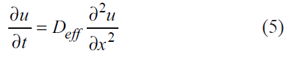 The effective moisture diffusion of OS was estimated using the Fick diffusion model (equation 5) while accounting for shrinkage [33]. Where Deff is the diffusion coefficient (m2/s), u is the concentration (mol/m3), t is the drying time (s), and x is the diffusion length (m).