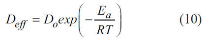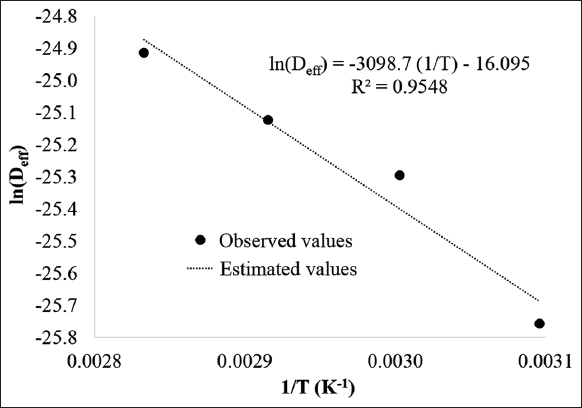 The activation energy was computed based on the Arrhenius equation (10), which represents how temperature affects effective moisture diffusivity [20]. Where Ea is the activation energy (kJ/mol), Do is the Arrhenius factor (pre-exponential factor, Do is equivalent to the diffusion at infinitely high temperature) (m2/s), R is the ideal gas constant (R = 8.314 J/mol.K), and T is the absolute temperature (K).