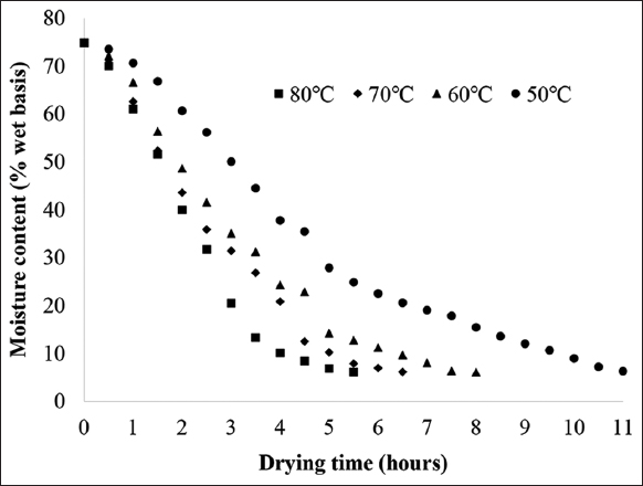 The convection drying process altered the moisture content of the OS [Figure 1]. Although it was demonstrated that the moisture content decreased steadily over the drying process, the high free moisture content in the raw material [42] causes the rate of moisture loss to occur quickly in the early stages of the drying process, after which the drying rate progressively drops. Because heat and mass transfer processes are faster when the drying temperature is gradually raised [43], the time needed to dry OS samples from the initial moisture content to the equilibrium value was reduced. In particular, the OS had an initial wet basis moisture content of 74.91 ± 1.06%; this number steadily drops throughout the drying process, reaching equilibrium at 6.30% moisture after 11 h of drying at 50°C. Meanwhile, at higher temperatures (60°C, 70°C, and 80°C), the drying time was reduced to 8 h, 6.5 h, and 5.5 h, respectively, to achieve equilibrium moisture. It was clear that the drying temperature affected the drying time.