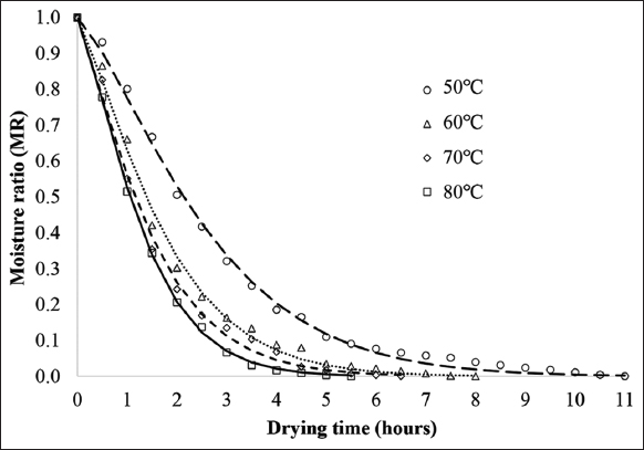| Figure 2: Variation in moisture ratio as a function of drying time at different temperatures. [Click here to view] |